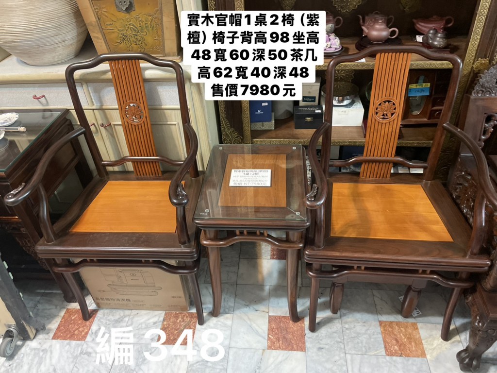 實木官帽1桌2椅(紫檀) 椅子背高98坐高48寬60深50 茶几高62寬40深48
