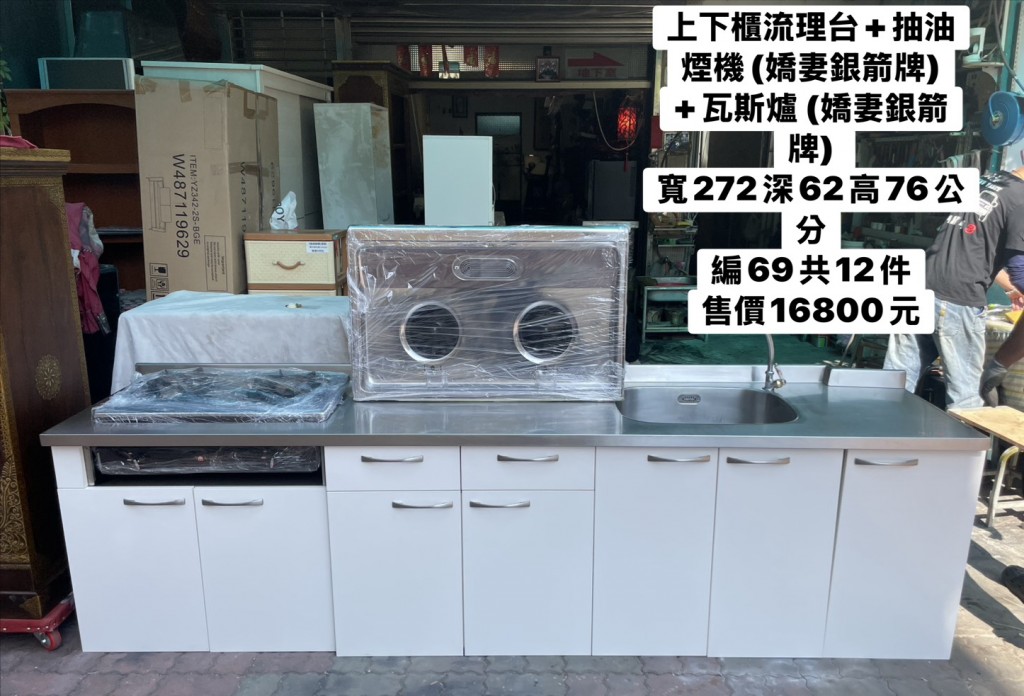 (已售出)上下櫃流理台+抽油煙機(嬌妻銀箭牌)+瓦斯爐 (嬌妻銀箭牌) 寬272深62高76公分 編69共12件